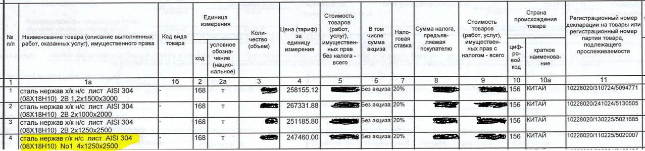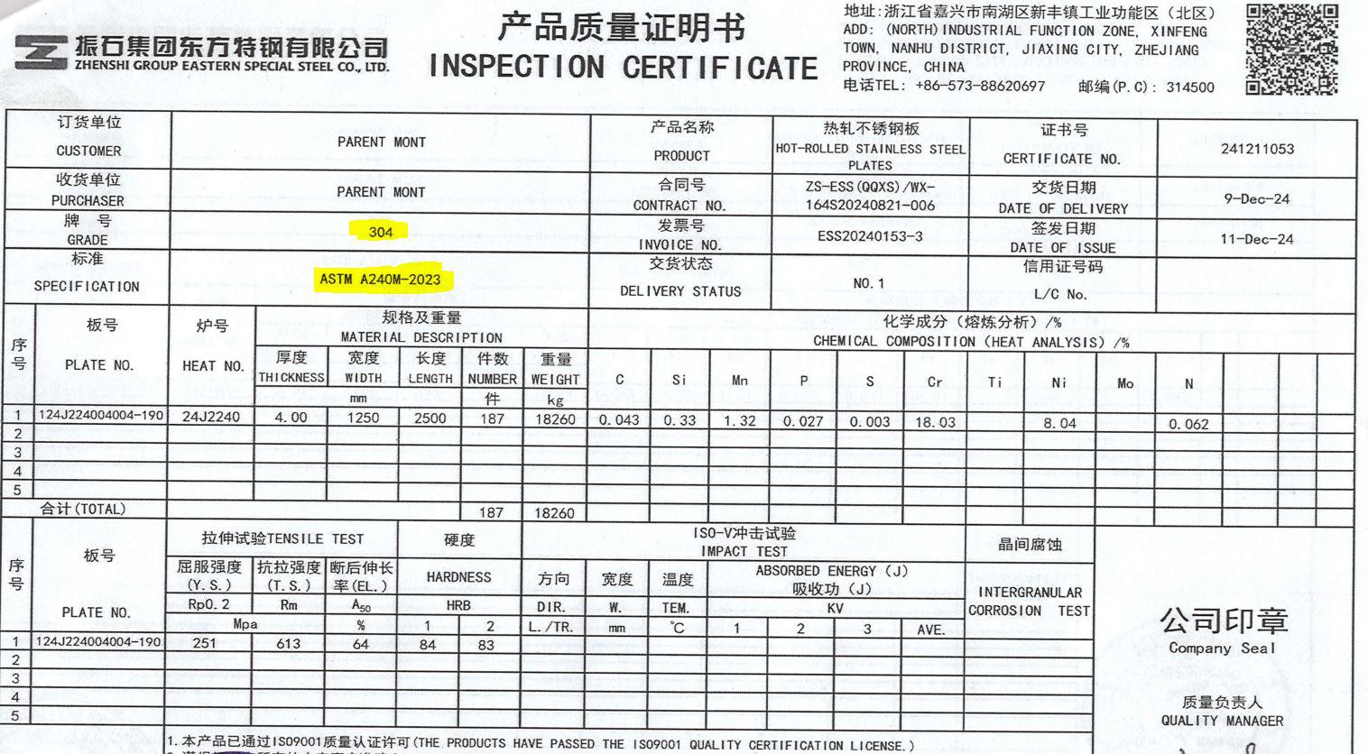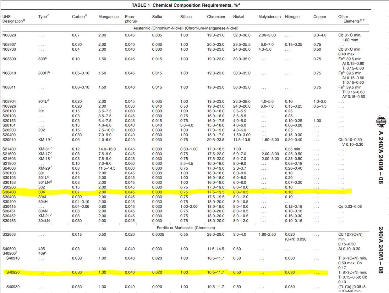 нержавейки отличается как от бухгалтерских документов, так и от приложенных сертификатов. Скачанный стандарт ASTM A240M-22, рассказал, что нам вместо стали AISI 304 производителя Zhenshi и по ее цене, отгрузили сталь марки AISI 409 производителя TISCO в которой количество хрома в 2 раза меньше, а количество никеля, как минимум в 16 раз меньше