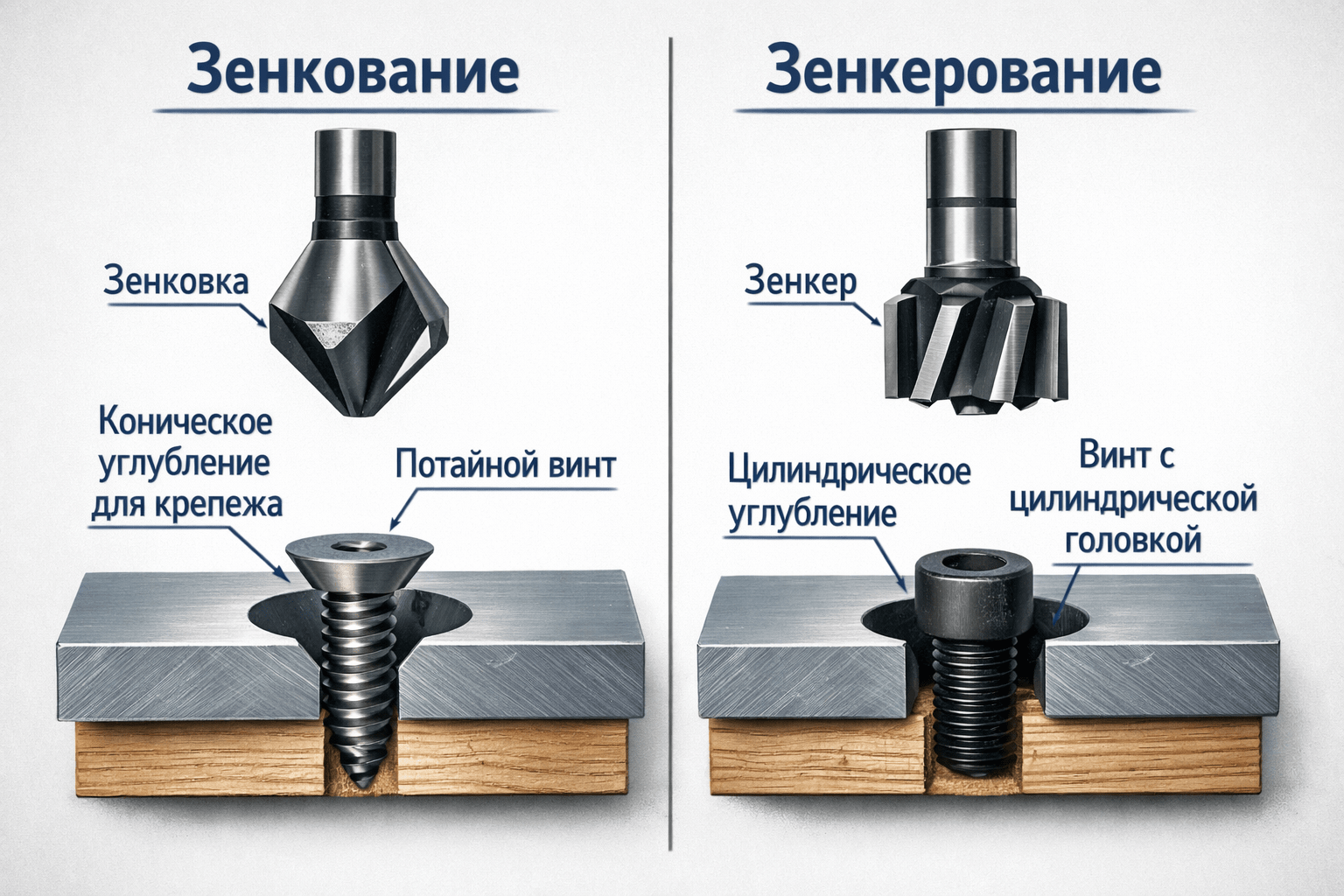 Для этой операции используют зенковки: конические — для фасок, и цилиндрические — для скрытых болтов и цековок. Именно поэтому запросы вроде «зенковка по металлу виды» и «инструмент для зенкования» всегда связаны с формой будущего крепежного узла.